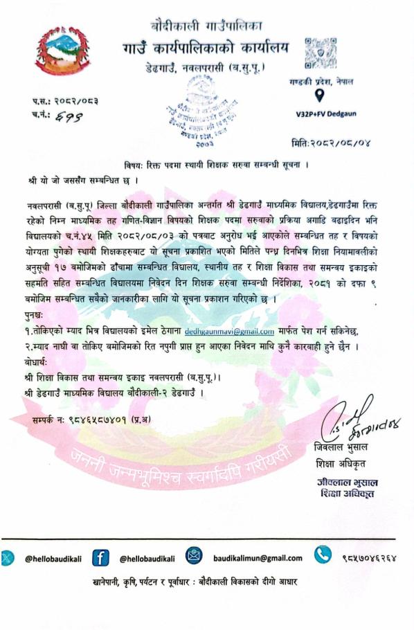 डेढगाउँ मा.वि. , बौदीकाली-२, डेढगाउँ, नवलपुरमा शिक्षक आवश्यकता सम्बन्धि सूचना