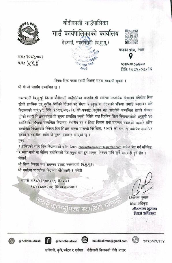 डेढगाउँ मा.वि. , बौदीकाली-२, डेढगाउँ, नवलपुरमा शिक्षक आवश्यकता सम्बन्धि सूचना