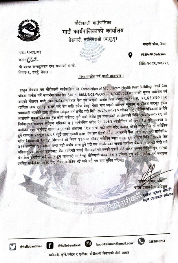 बोलपत्र स्विकृति गर्ने आशयको सूचना २०७६/०८/३०