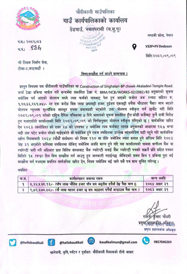 बोलपत्र स्वीकृत गर्ने सम्बन्धी आशयको सूचना ।
