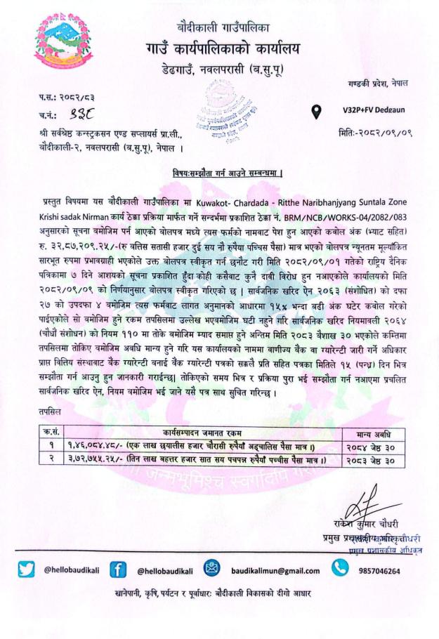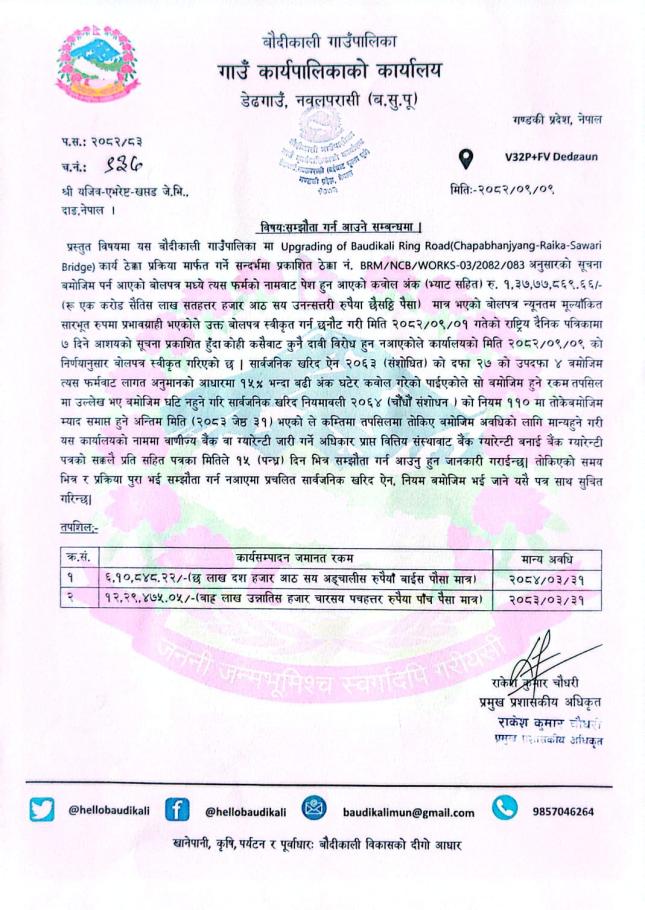 बोलपत्र स्वीकृत गर्ने आशयको सूचना ।