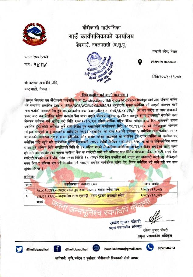 बोलपत्र स्वीकृत गर्ने आशयको सूचना ।