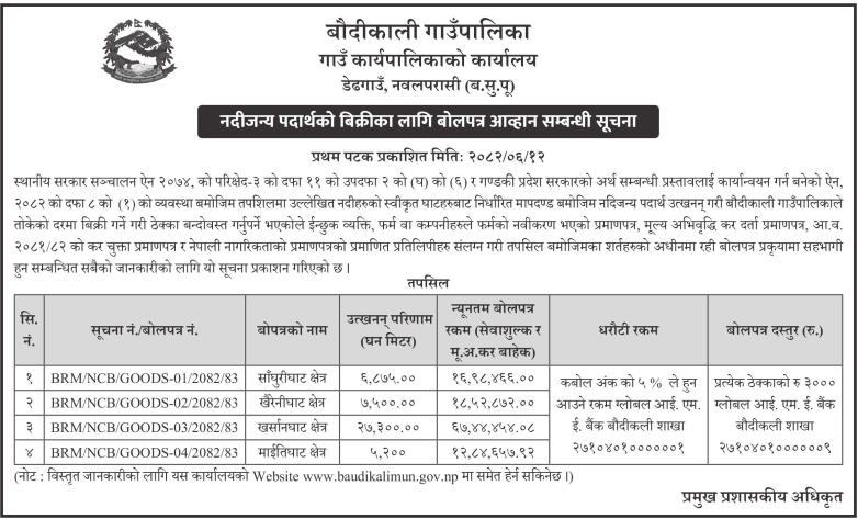 नदिजन्य पदार्थ बिक्रिका लागि बोलपत्र आव्हान सम्बन्धी सूचना ।
