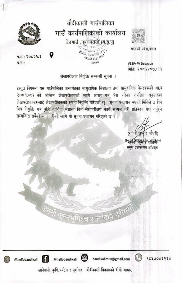 बौदीकाली गाउँपालिका भित्रका सामुदायीक विधालयहरुको आ.व. २०७५/०७६ सम्मको लेखा परिक्षणको लागि इच्छुक दर्ता वाला लेखा परिक्षणहरुकाे आवेदन सम्बन्धि सुचना ।।